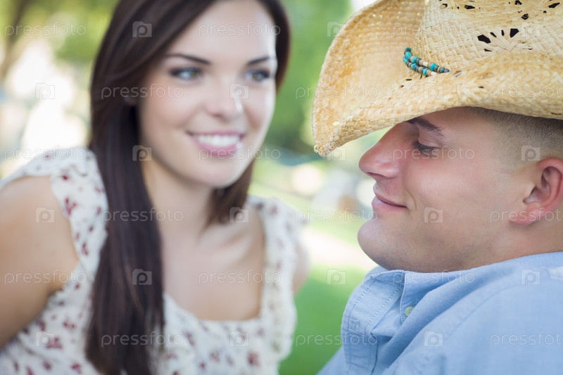 Романтическая пара с ковбойской шляпой флиртует в парке