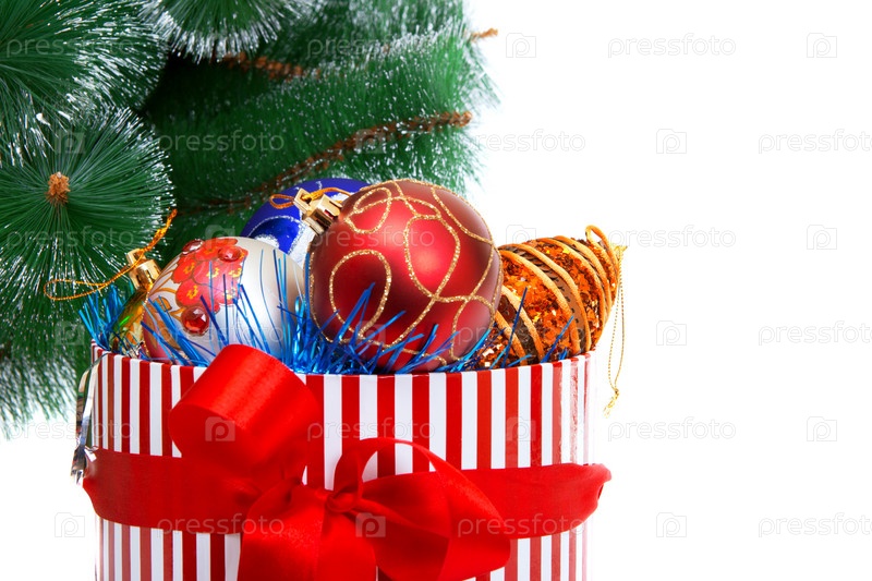Коробка с новогодними игрушками на фоне ели