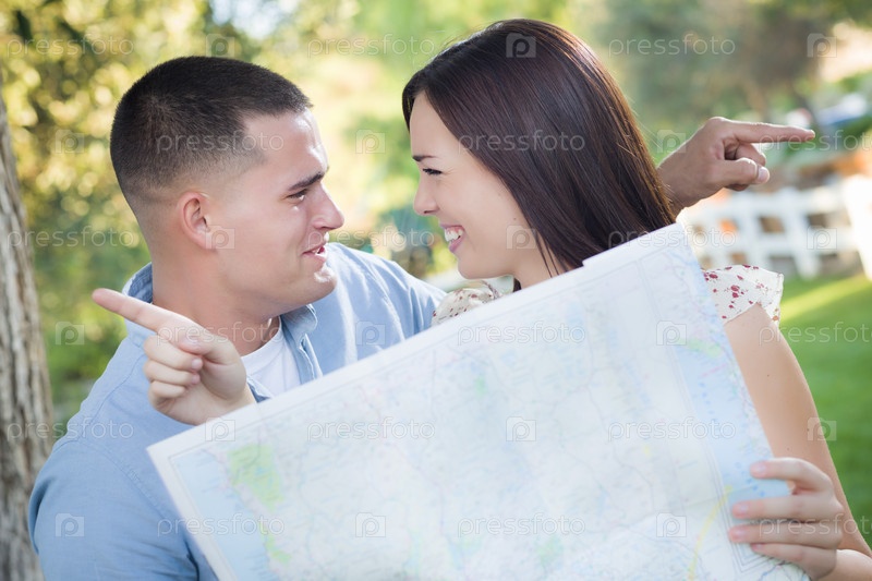 Заблудившаяся на природе пара смотрит на карту