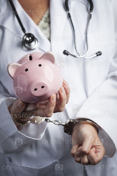 Врач в халате с копилкой и в наручниках