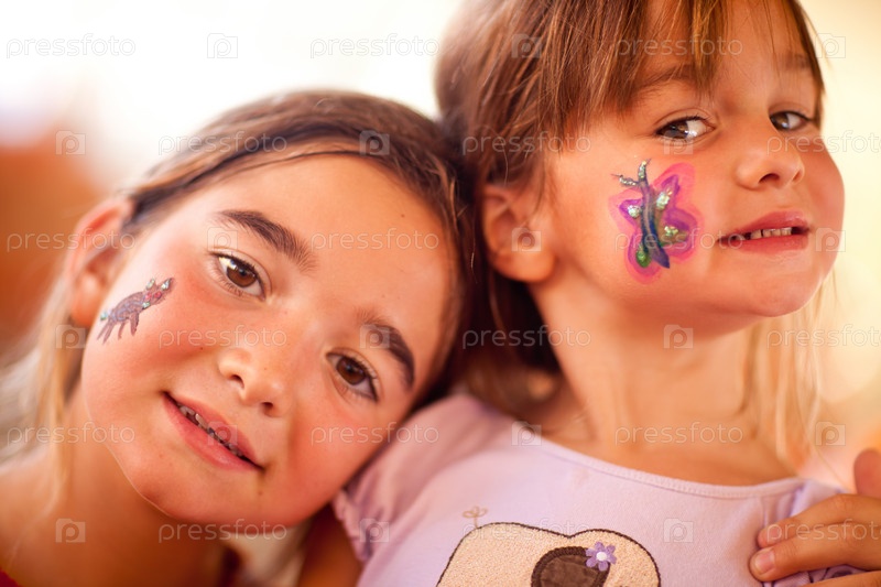 Милые девочки показывают разрисованные лица на празднике
