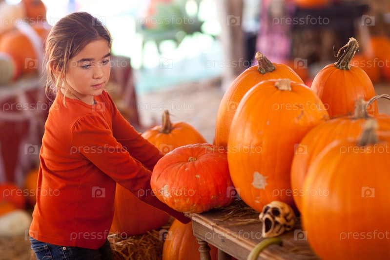 Симпатичная девочка выбирает тыкву