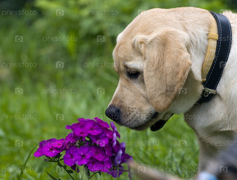 Собака, нюхающая цветок