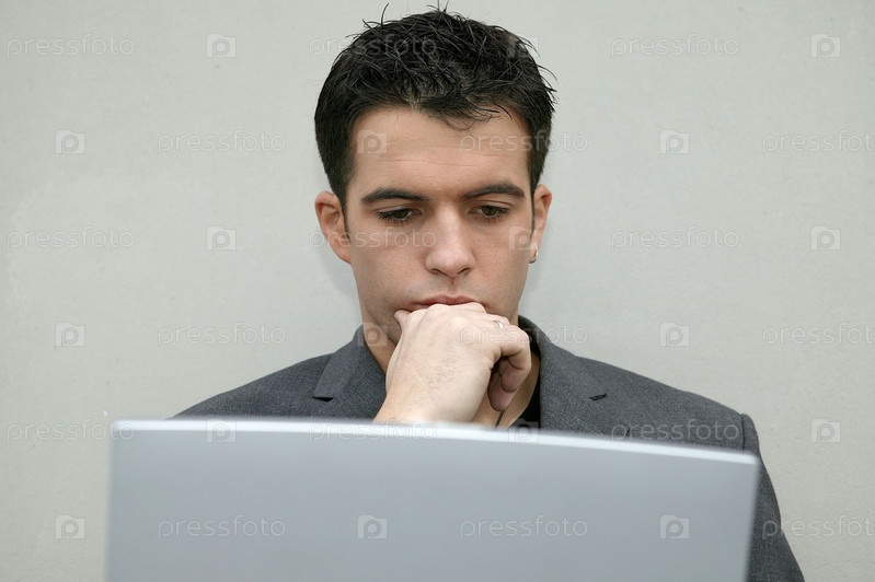 Серьезный мужчина смотрит на свой ноутбук
