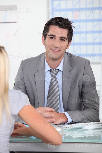 Мужчина в костюме сидит через стол от молодой женщины