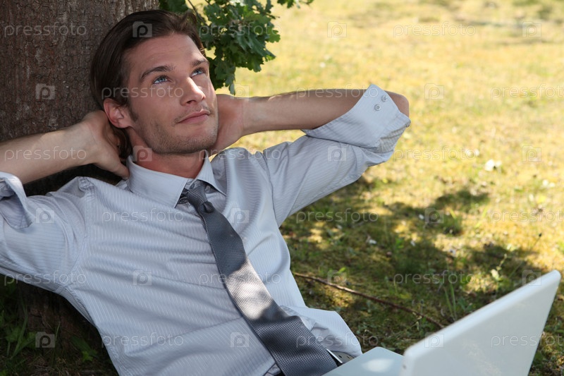 Бизнесмен с ноутбуком под деревом
