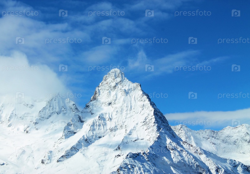 Заснеженные вершины гор на фоне синего неба