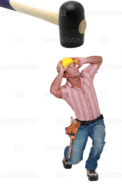 Человек в панике, раздавленный гигантским молотком