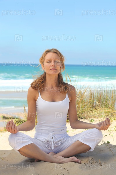 Женщина медитирует на пляже