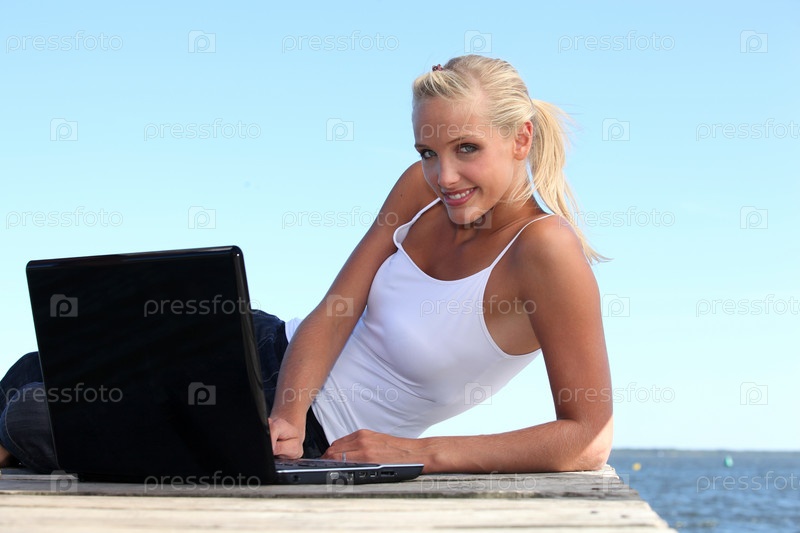 Женщина с компьютером на пирсе