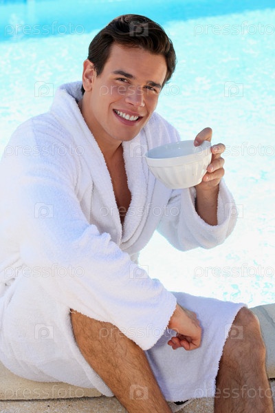 Парень пьет кофе на краю бассейна