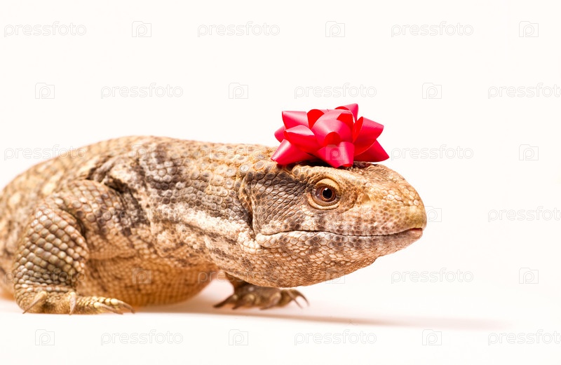 Степная ящерица-монитор с красной лентой для подарков на голове