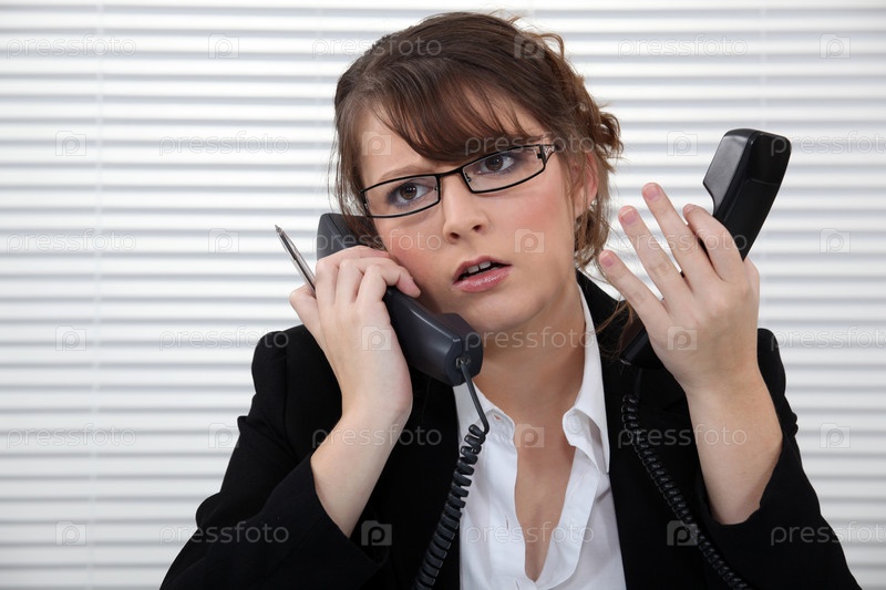 Расстроенный офисный работник с двумя телефонами