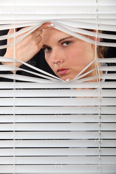 Женщина смотрит через жалюзи