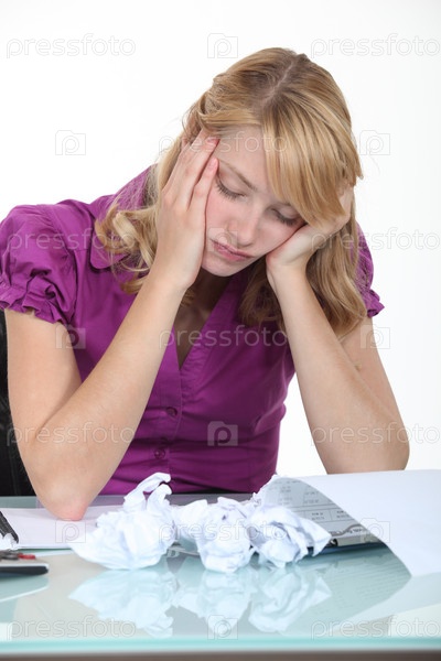 Женщина за столом, усыпанным смятой бумагой