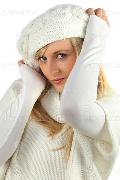 Кокетливая молодая блондинка в белом кардигане и берете