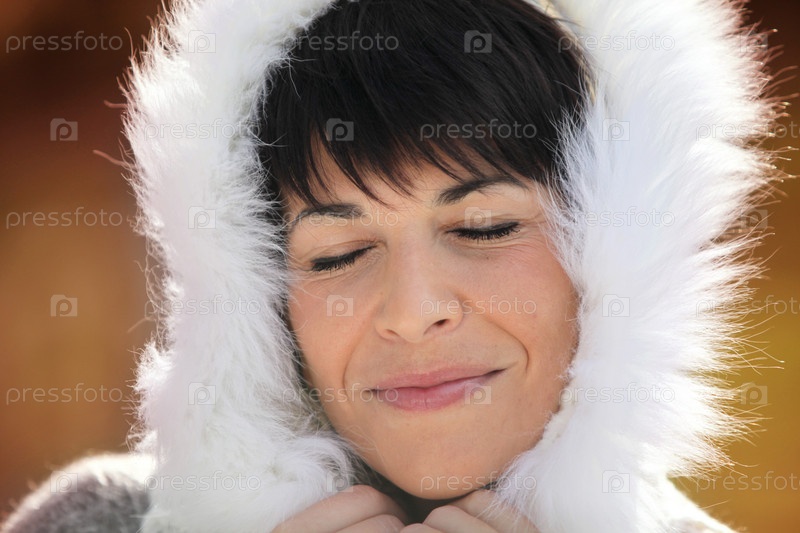 Женщина в пальто с пушистым капюшоном