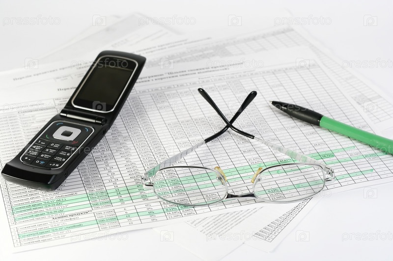 Очки, сотовый телефон и ручка лежат на документах