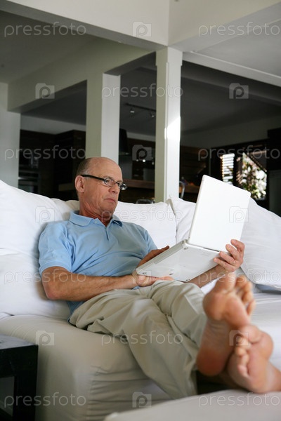 Пожилой босой мужчина на диване