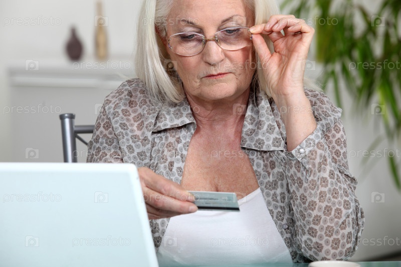 Пожилая женщина делает покупки онлайн с помощью кредитной карты