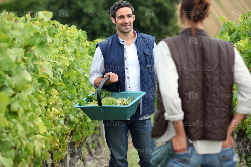 Пара собирает виноград