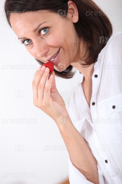 Брюнетка ест клубнику