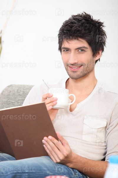 Молодой человек читает книгу и пьет кофе на диване