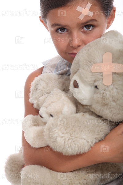 Девочка и мишка с лейкопластырем на лбу