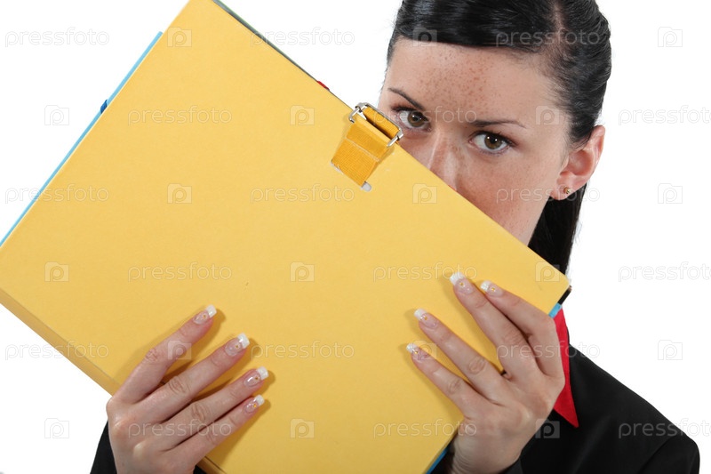 Бизнес-леди закрывает лицо файлом