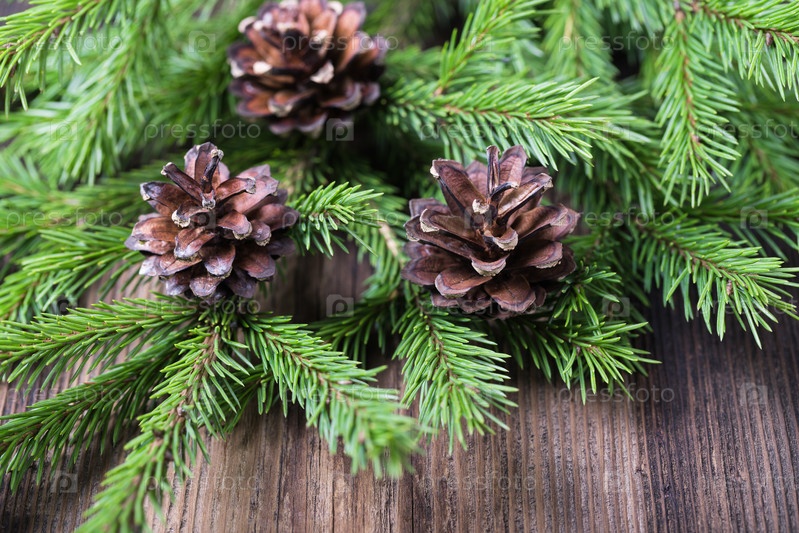 Ветки ели с шишками на старом деревянном столе