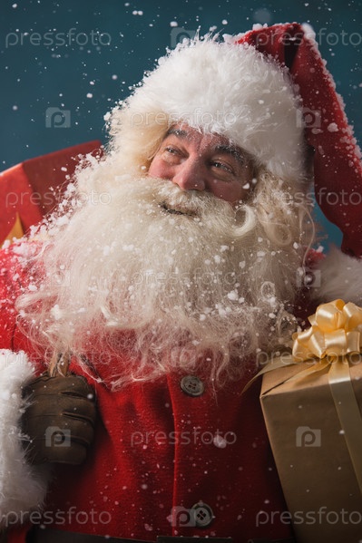Санта-Клаус в снегопад несет подарки