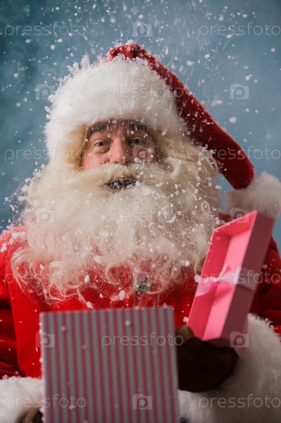Счастливый Санта-Клаус открывает Рождественский подарок на Северном полюсе