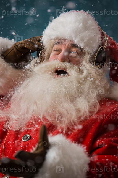 Санта-Клаус слушает музыку в наушниках на открытом воздухе на Северном полюсе