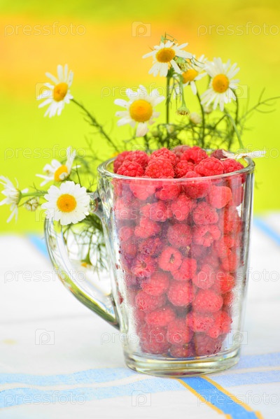 Спелая малина в стеклянной чашке