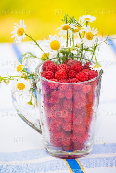 Спелая малина в стеклянной чашке