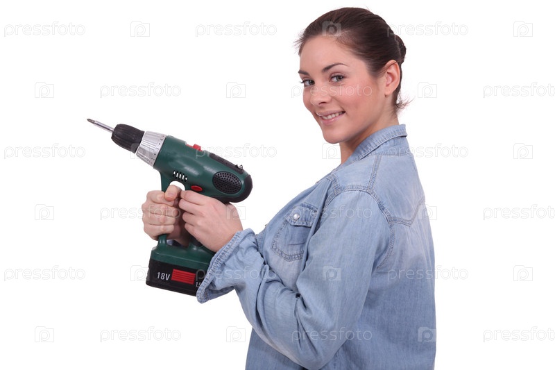 Женщина, держащая дрель на белом фоне