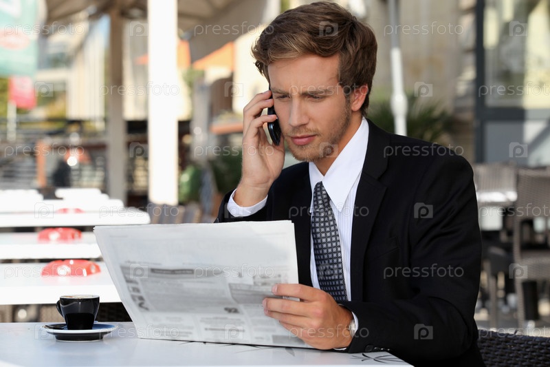 Молодой человек с телефоном читает газету