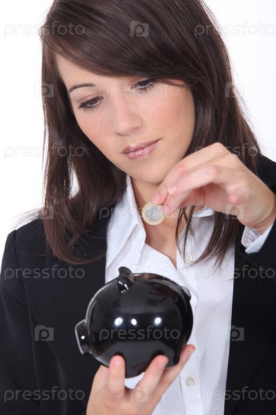 Молодая женщина бросает евро в копилку
