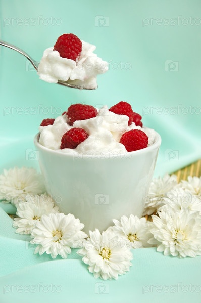 Малина со взбитыми сливками в чашке