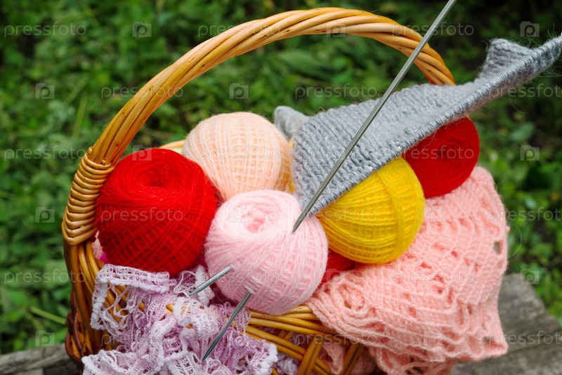 Корзина с пряжей и спицами