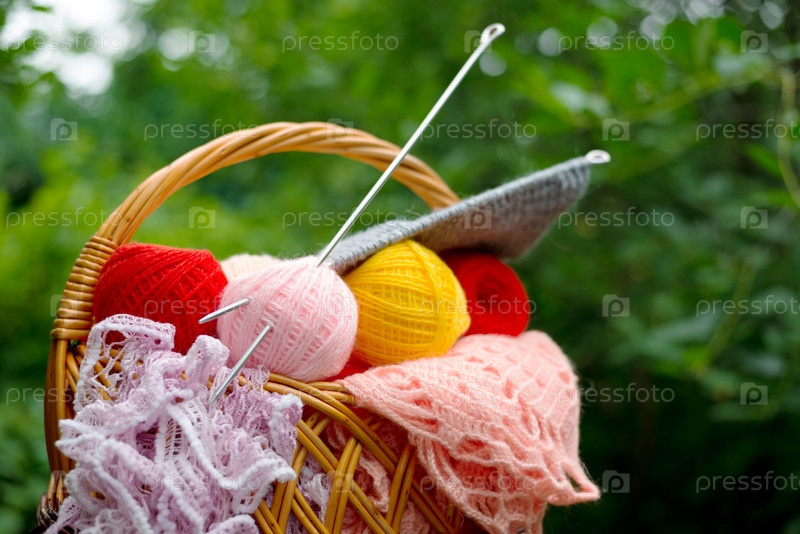 Корзина с пряжей и спицами
