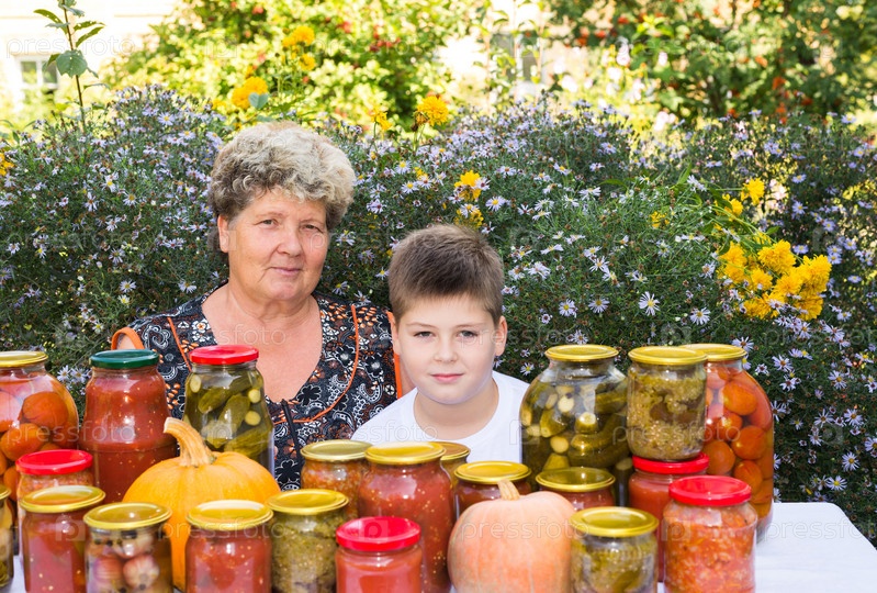 Бабушка с внуком и домашними овощными консервами