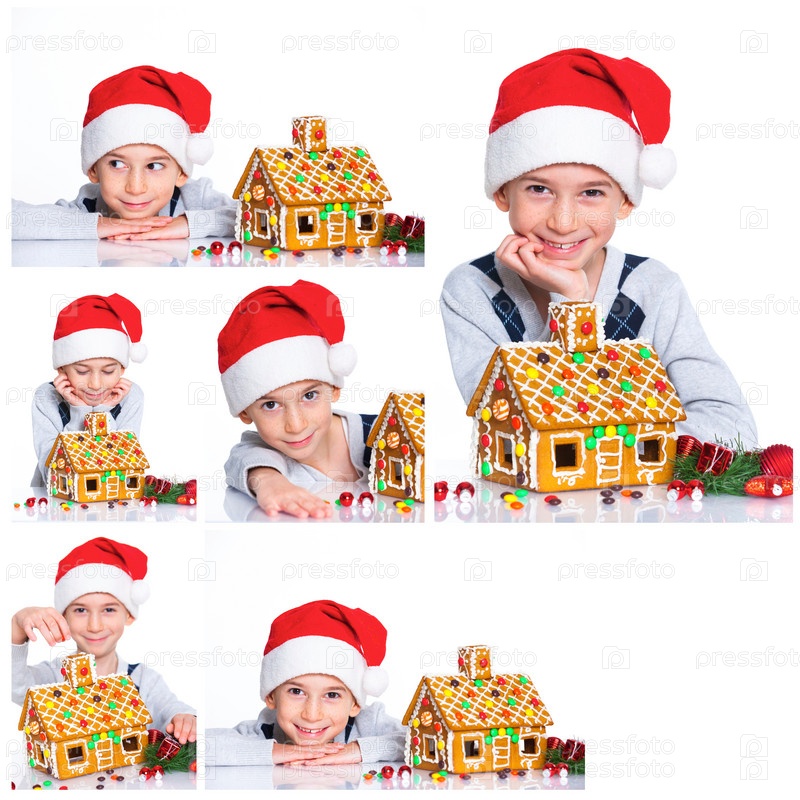 Маленький мальчик в шапке Санта-Клауса с бревенчатым домом