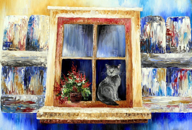 Картина "Кошка на окошке", художественное масло, мастихиновая техника