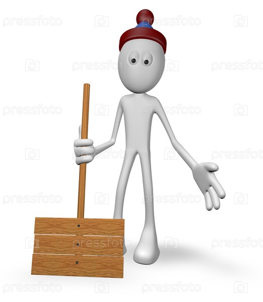 Маленький человек со снежной лопатой - 3D иллюстрация