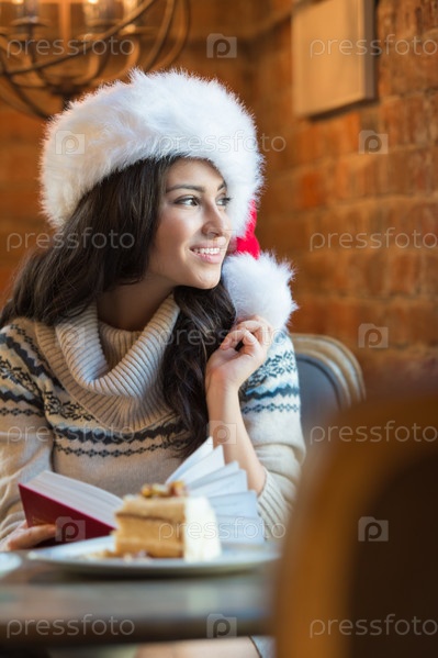 Красивая молодая женщина в красной шапке Санта-Клауса сидит в кафе