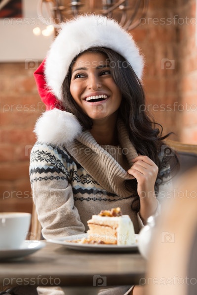 Красивая молодая женщина в красной шапке Санта-Клауса сидит в кафе