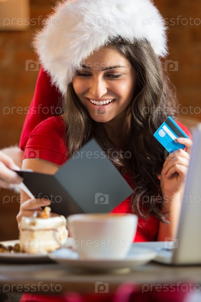 Красивая молодая женщина в колпаке Санта-Клауса оплачивает покупки картой