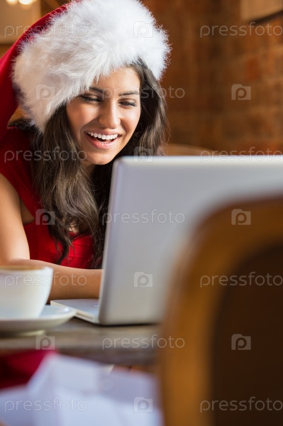 Красивая молодая женщина в колпаке Санта-Клауса сидит в кафе