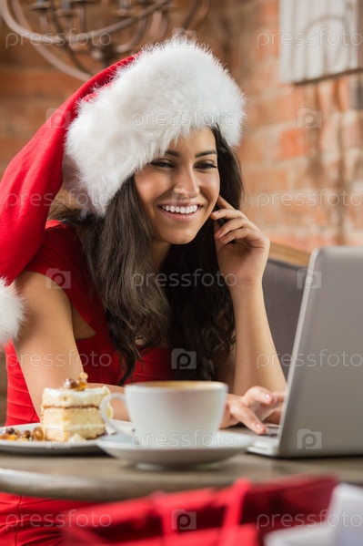 Красивая молодая женщина в колпаке Санта-Клауса сидит в кафе